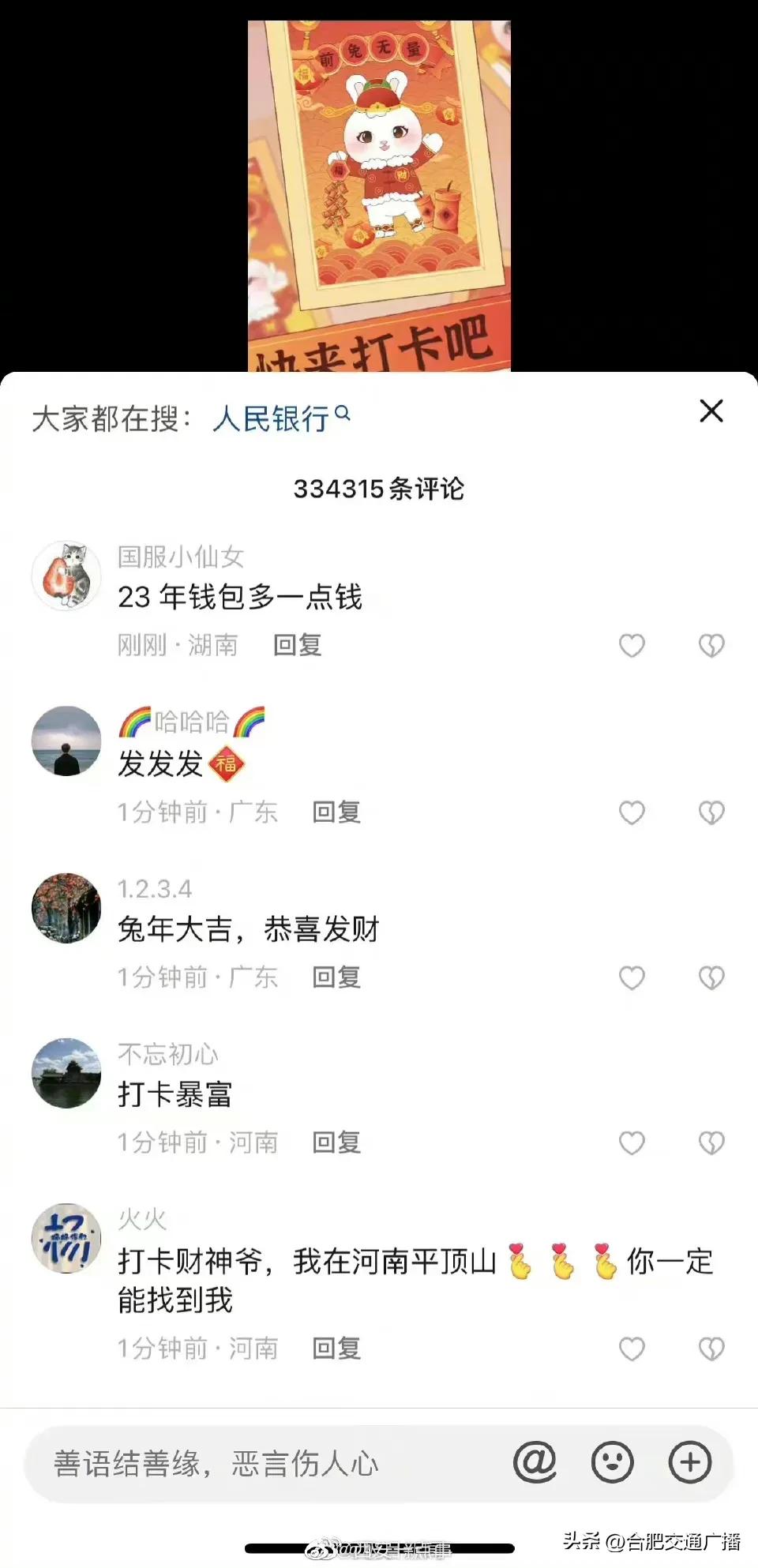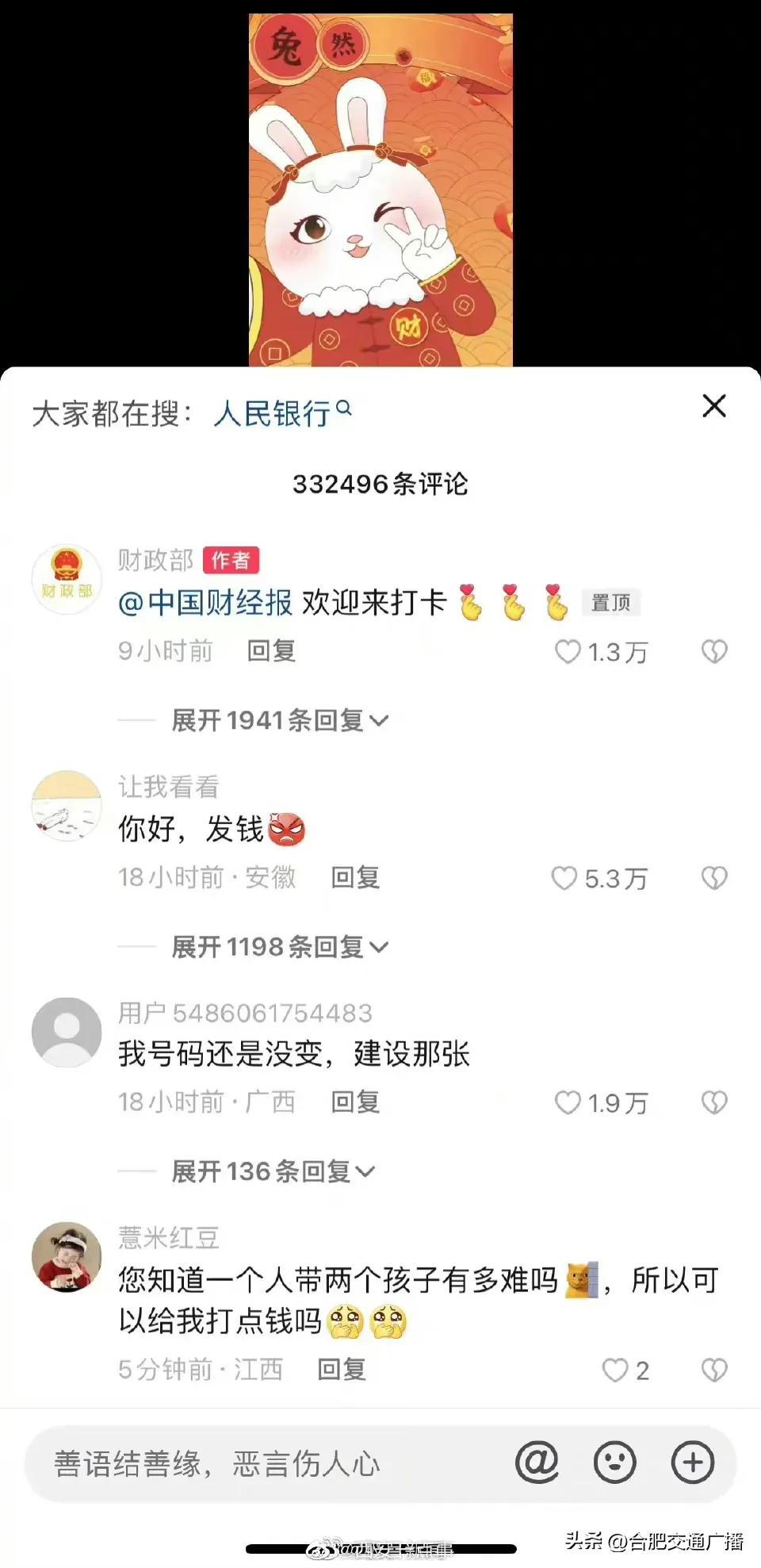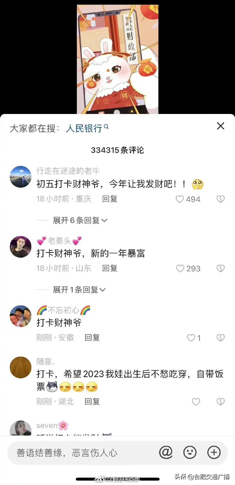 大年初五财政部账号成网友打卡地(网友纷纷给“真财神爷”花式留言) 2023-01-26 热点新闻 10972 作者:网友投稿 今天(1月26日)正月初五,是很多地方“迎财神”的日子。财政部在今天发了一条“都来打卡财政部”的动画短视频,引来网友们的点赞和转发,祈求新年“财运亨通”。