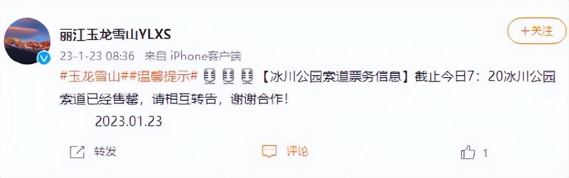 春节假期这几天,玉龙雪山、丽江古城等,景区景点的热度居高不下,大年初二一大早丽江玉龙雪山景区发布通知,冰川公园索道票已售罄。